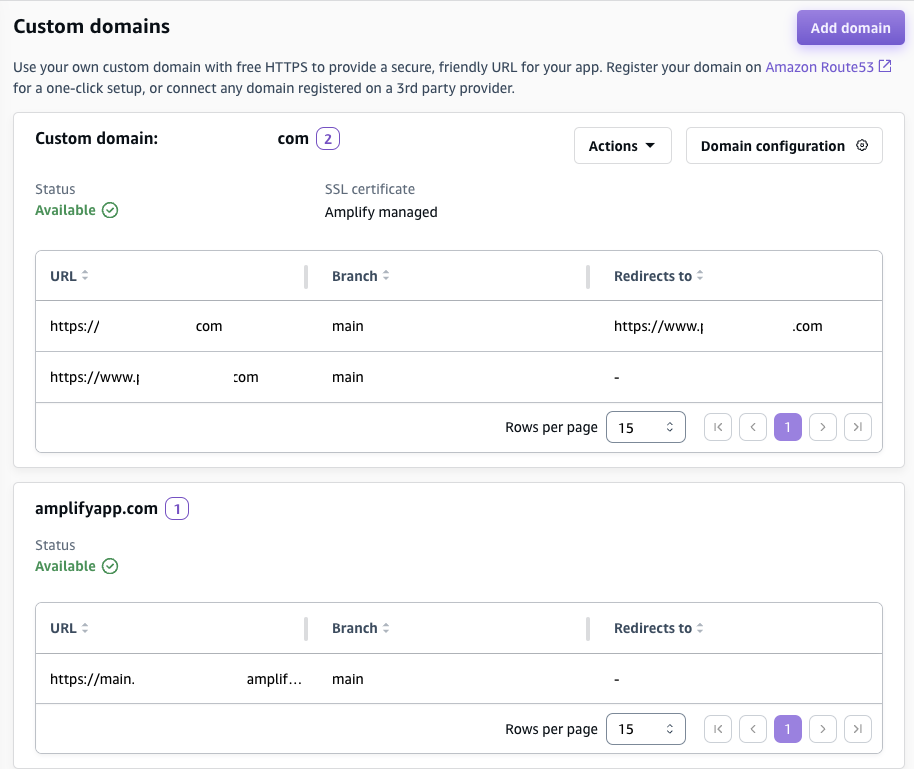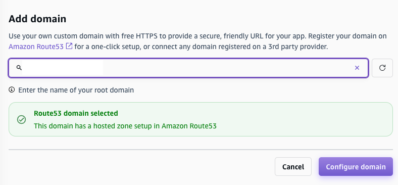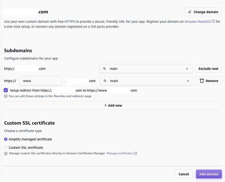 Go to Hosting > Custom domains, set up the custom domain we owned. I already bought this domain on AWS Route 53 for a while, so I don’t demonstrate how to buy domain on AWS.
