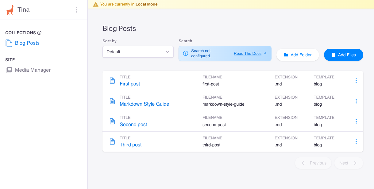 After defining the content schema in the TinaCMS configuration file, we can view the sample data provided by the Astro blog template.