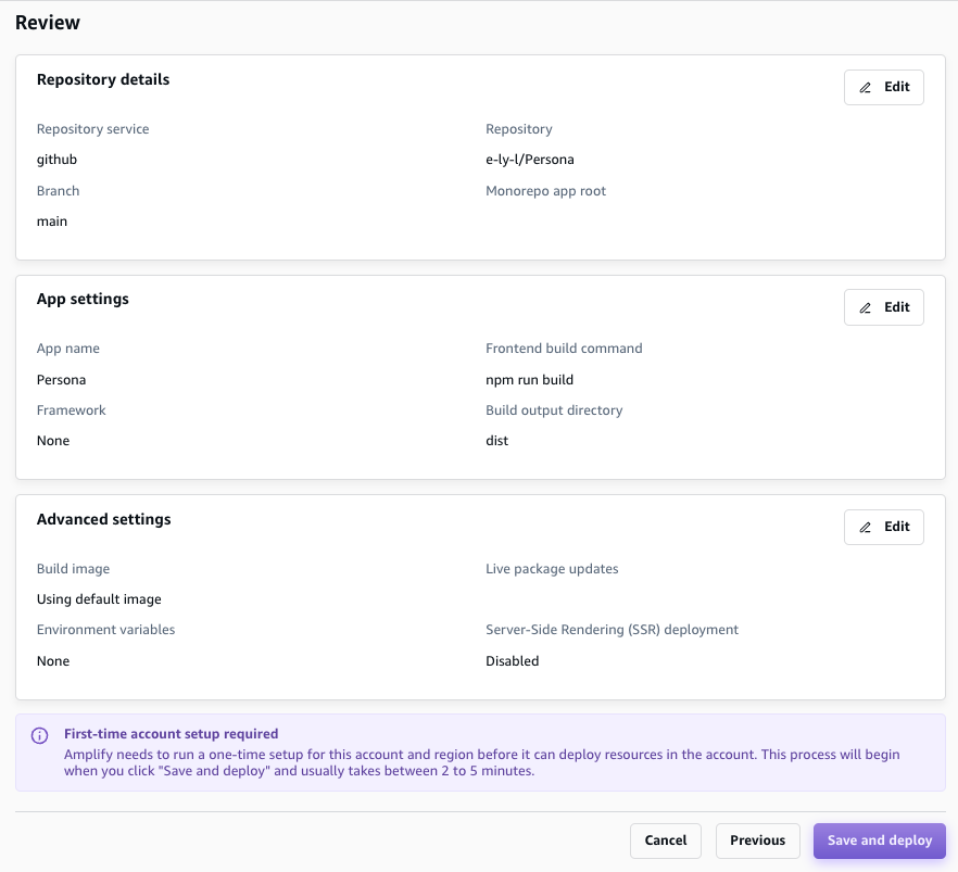 So we choose Amplify in AWS dashboard. Choose the Git repository, deployment branch and build setting then deploy.